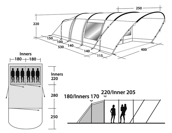 - Type of tent: Three-room tunnel tent.